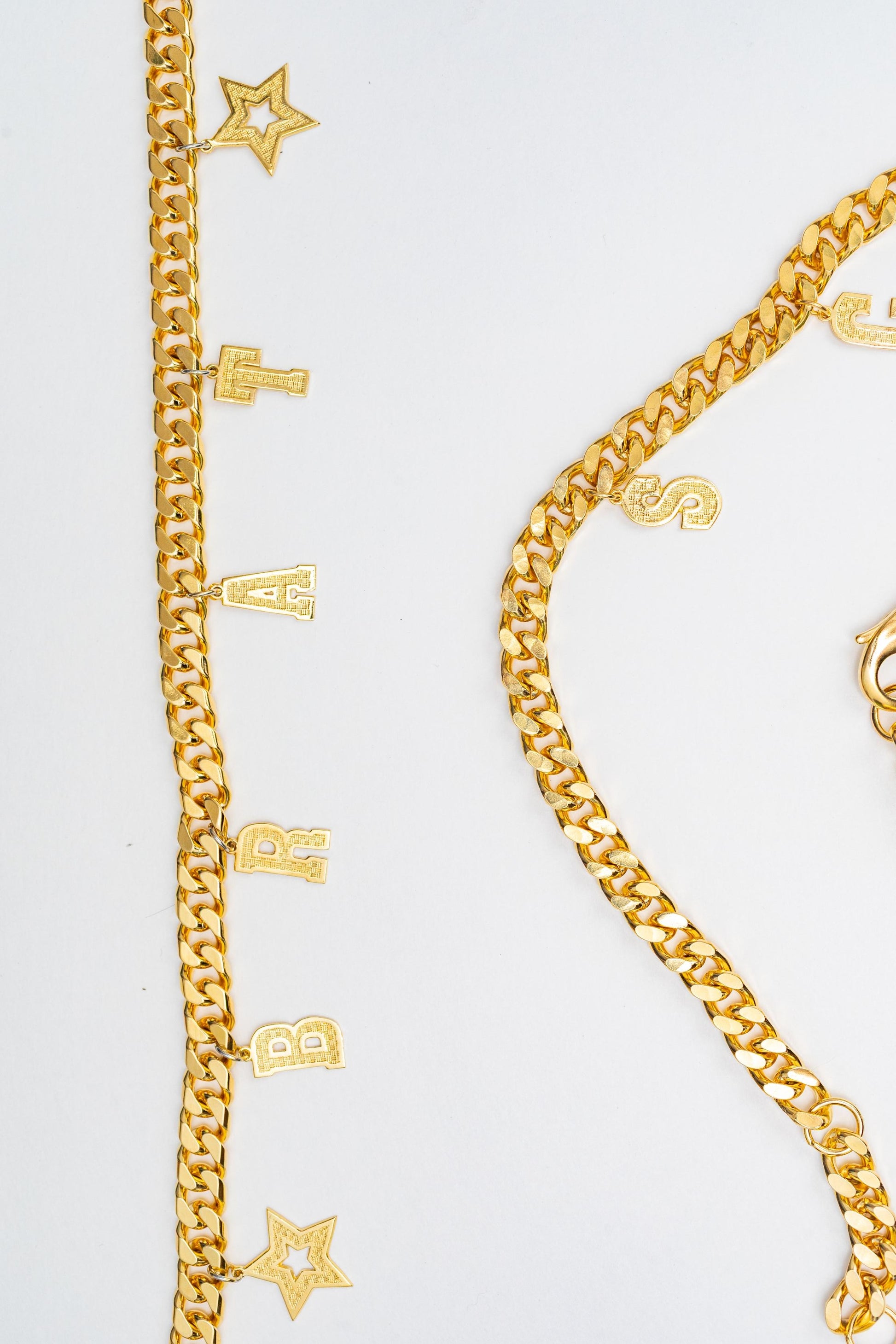 Your name, your mantra, your moment; now wrapped around your waist. The Name Drop Belly Chain lets you spell out up to eight letters or symbols in bold metal, linked on a heavy curb chain that drapes low or at your waist. A star, heart,l bolt, hashtag, or lemon slice charm can punctuate the story — your story.